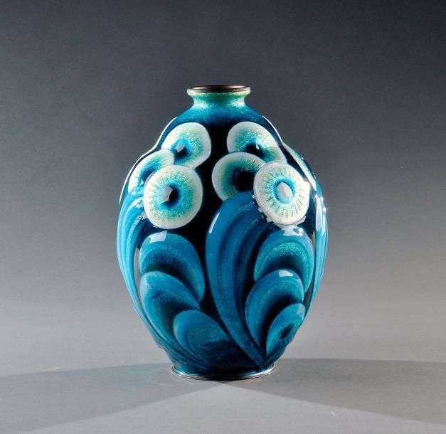 Exceptionnel et rare vase à corps de forme ovoïde présentant un col étranglé évasé en cuivre à décor émaillé de motifs géométriques dans les tons bleus. Il repose sur une base circulaire plate et un col annelé en laiton. Signature à l'or "C.Fauré Limoges". Vers 1930. H: 30,5 cm An exceptional, rare copper vase enamelled with geometrical motifs and standing on a brass base. Gold signature "C.Fauré Limoges". Circa 1930. H: 12 in Bibliographie: Alberto Shayo, "Camille Fauré, Limoges Art Deco Enamels, the geometry of joy», Antique collectors' club, Woodbridge, 2007, modèle similaire reproduit aux pages 1 et 215.