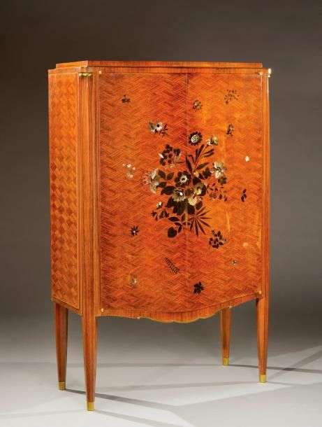 Meuble de rangement à caisson cubique mouluré galbé en placage de palissandre des Indes ouvrant en façade par deux portes à décor marqueté de motifs floraux en bois exotique et nacre sur fond de losange. Il repose sur quatre montants droits fuselés à facettes agrémentés d'éléments en bronze doré. Vers 1930-1940. H: 130 cm L: 82 cm P: 39 cm (rayures d'usage et taches) A rosewood of the Indies veneer cupboard opening by two doors with an exotic wood and mother of pearl marquetry. Circa 1930-1940. H: 51 ¼ in L: 32 ¼ in D: 15 ¼ in