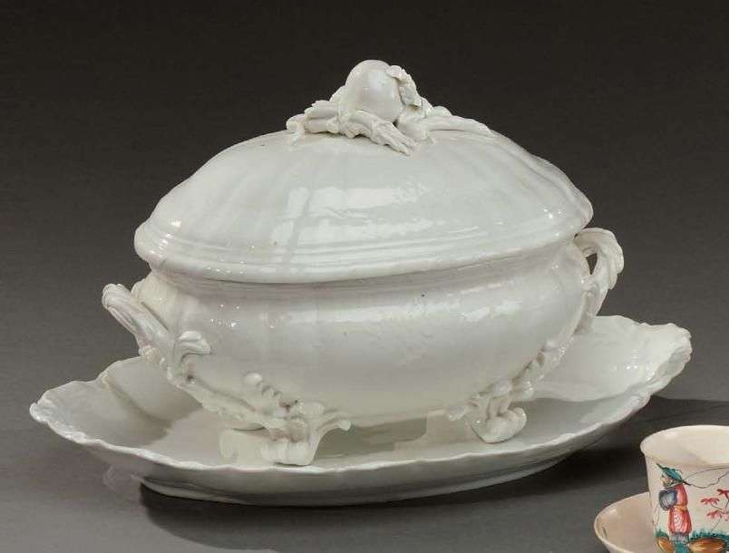Belle soupière en porcelaine blanche reposant sur quatre pieds. Prise à décor de légumes. XVIIIème siècle L: 35 cm On y joint un présentoir d'un modèle proche. L: 40 cm