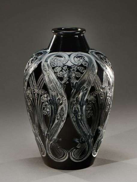 Exceptionnel et rare vase « Lézards et bleuets » en verre noir soufflé-moulé et satiné. Signé «R.Lalique». Modèle créé en 1913.