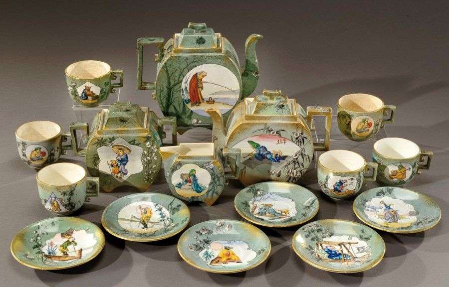 Rare service en faïence à émaux en relief sur fond vert saupoudré d'or comprenant deux verseuses, un sucrier, un pot à lait et six tasses avec leur sous-tasse. Le décor aux formes géométriques épurées issu des répertoires décoratifs japonais, et notamment de la Manga Hokusai est probablement dû à Amédée de Caranza qui arriva à la Manufacture peu avant l'exposition universelle de 1878. L'ensemble des pièces est orné de ce décor cocasse qui met en scène des personnages mi-hommes mi-animaux vêtus de kimonos dans un entourage naturel composé d'arbres et d'insectes. Ceux-ci sont occupés à pêcher, à jouer de la flûte ou encore de l'accordéon. Marque au revers du «cartouche japonais». Le musée des Arts Décoratifs de Bordeaux possède dans ses collections un exemplaire de ce service. Vers 1878-1880. H: 19,5 cm (verseuse) An earthenware service with raised enamels on a background sprinkled with gold, consisting of two pourers, a sugar holder, a milk jug and six cups and saucers. The simple geometrical decoration is typically Japanese inspired, notably Manga Hokusai and is probably due to Amédée de Carranza who arrived at the Manufacture just before the Exposition Universelle of 1878. The complete set is decorated with half-human, half-animal characters dressed in kimonos and busy fishing or playing flutes or accordions. Mark on the reverse side «cartouche japonais». Circa 1878-1880. The Musée des Arts Décoratifs of Bordeaux has an example of this service. H: 7 ¾ in (pourer) Bibliographie: Jacqueline du Pasquier, «J.Vieillard et Cie, histoire de la faïence fine à Bordeaux», modèle reproduit page 127.