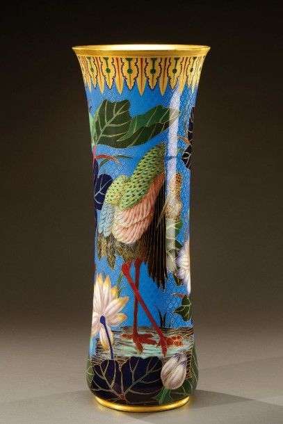 Important vase de forme cylindrique évasée en porcelaine à décor émaillé polychrome et rehaussé de dorure de motifs floraux et de grues. Décors japonisant à limitation des cloisonnés. Tampon de l'«Escalier de Cristal, n°1 rue Auber, près l'Opéra». Vers 1880. H: 59,5 cm (percé pour électrification et fêle) A large porcelain vase enamelled with floral motifs and cranes. A stamp of the Escalier de Cristal n°1 rue Auber, près l'Opéra. Circa 1880. H: 23 ½ in