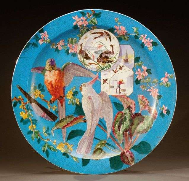 Important plat creux circulaire en céramique émaillée polychrome figurant deux cacatoès branchés sur des arbres en fleurs à décor dans des cartouches d'une scène historiée asiatique et de volatiles dans un paysage lacustre sur un fond bleu à motifs géométriques à l'or. Signé du cachet en creux «Montereau». Vers 1890. Diam: 60,5 cm A large enamelled ceramic dish representing two cockatoos in blossoming trees, a scene of Asian history, and birds in a lakeside scene with gold geometrical motifs. Intaglio signature «Montereau». Circa 1890. Diam: 23 ¾ in