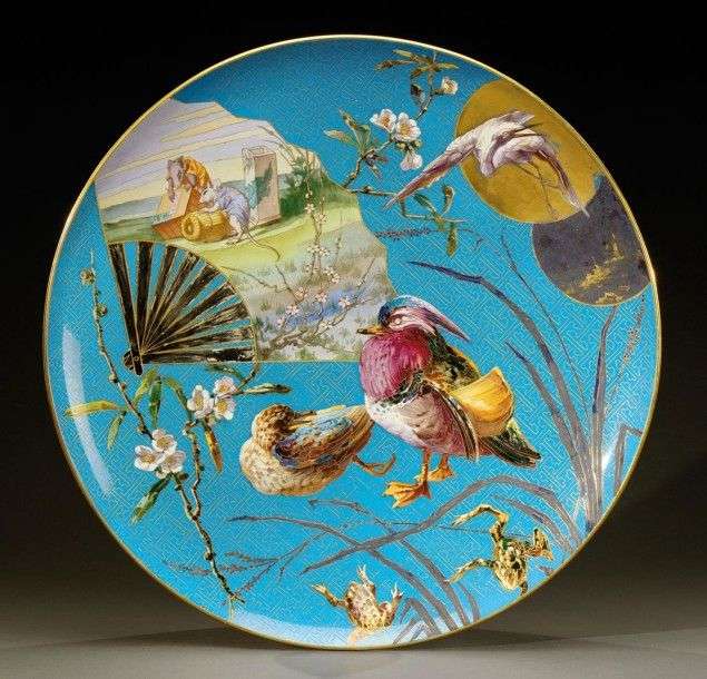 Important plat circulaire en céramique émaillée polychrome à décor d'oiseaux, de grenouilles et d'un éventail historié sur fond bleu à motifs géométriques à l'or. Signé du cachet en creux «Montereau». Vers 1890. Diam: 49 cm A large enamelled ceramic dish decorated with birds and a historiated fan on a geometrical motif background. Intaglio signature «Montereau». Circa 1890. Diam: 19 ¼ in