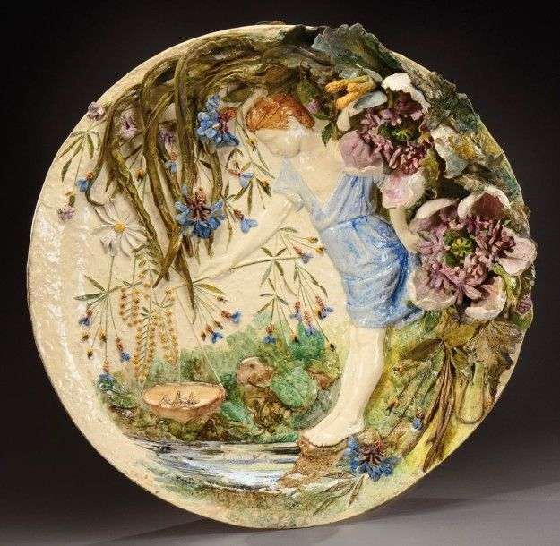 Important plat circulaire en céramique émaillée polychrome présentant un important décor en relief figurant un jeune garçon pêchant des langoustines dans un paysage lacustre à motifs floraux. Vers 1890. Diam: 58 cm A polychrome enamelled ceramic dish representing a young boy fishing langoustines in a lakeside scene. Circa 1890. H: 4 ¾ in Diam: 22 ¾ in