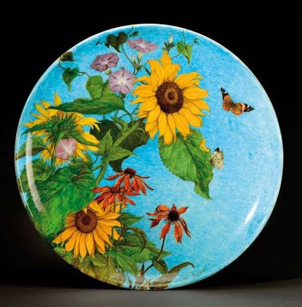 «Soleils» Important plat circulaire en céramique émaillée polychrome à décor de tournesols et de papillons en vol. Titré au dos «Soleils», numéroté, signé dans le décor «A.L. Regnier» et en creux du profil et «Th.Deck». Vers 1880-1890. Diam: 61 cm A large enamelled ceramic dish decorated with sunflowers and butterflies. Titled on the back «Soleils», numbered, signed in the background «A.L. Regnier» and intaglio in profile and «Th.Deck». Circa 1880-1890. Diam: 24 in