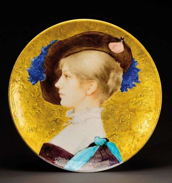 Important plat circulaire en céramique émaillée polychrome figurant un profil de femme au chapeau sur fond doré à décor en léger relief de lions héraldiques. Signé en creux «Th.Deck» et «R.Collin» dans le décor. L'artiste, après avoir fait des faïences dans le goût persan ou chinois, recouvre d'un émail transparent les boursouflures des ses terres dorées (procédé appris à Venise). Deck, originaire de Guebwiller, voyagea en Autriche, en Hongrie et en Bohême, ce qui explique son goût pour la renaissance allemande. Vers 1880-1890. Diam: 50 cm A large polychrome enamelled dish with the profile of a woman wearing a hat on a gold background decorated with heraldic lions. Intaglio signature «Th.Deck» and «R.Collin» in the background. The artist, after having made Persian or Chines style earthenware pieces covered his blistered golden earth with transparent enamel (as he had learnt in Venice). Deck who came originally from Guebwiller had travelled in Austria, Hungary and Bohemia which explains his interest for German Renaissance. Circa 1880-1890. Diam: 19 ¾ in Bibliographie: Maurice Rheims, «L'objet 1900», AMG, Paris, 1964, pour un modèle de construction similaire reproduit à la page 24.