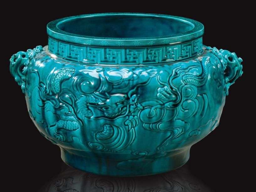 Important cache-pot circulaire à anses et col resserré en céramique émaillée bleu turquoise craquelé à décor en léger relief de dragons volants dans les nuages et de frises de motifs géométriques. Signé «TH Deck» et au profil. Vers 1880-1890. H: 31.5 cm Diam: 53 cm (restaurations) A large ceramic flower pot holder enamelled in turquoise with flying dragons. Signed «TH Deck». Circa 1880-1890. H: 12 ½ in Diam: 20 ¾ in