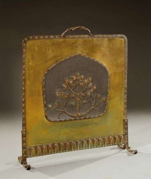 Ecran de cheminé en laiton doré à décor ajouré de motifs floraux. Signé «Paul Brindeau». Vers 1910. H: 75 cm L: 65,5 cm A gilded brass fireplace screen with floral motifs. Signed «Paul Brindeau». Circa 1910. H: 29 ½ in L: 25 ¾ in