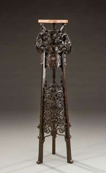 Sellette de présentantion en fer forgé martelé à patine noire présentant un plateau circulaire à pans coupés en marbre rouge veiné blanc reposant sur trois montants droits à décor floral ajouré agrémenté de trois cabochons en verre polychrome. Vers 1910. H: 107 cm Diam: 30 cm A hammered wrought iron stand with a circular red marble top on three uprights embellished with polychrome glass cabochons. Circa 1910. H: 42 ¼ in Diam: 11 ¾ in