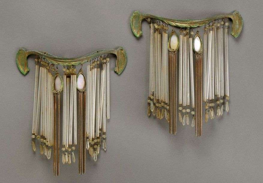 Paire d'appliques à une lumière à platines de fixation courbées rainurées en bronze à patine anciennement doré flanquée de cabochons et enserrant une série de tubes de verres et composé de deux médaillons ovales en verre opaque légèrement teinté rose. Vers 1900. H: 26 cm L: 26 cm P: 6 cm (usures au aux tubes de verres et manques) A pair of wall lights holding a series of glass tubes and two opaque glass medallions. Circa 1900. H: 10 ¼ in L: 10 ¼ in D: 2 ¼ in