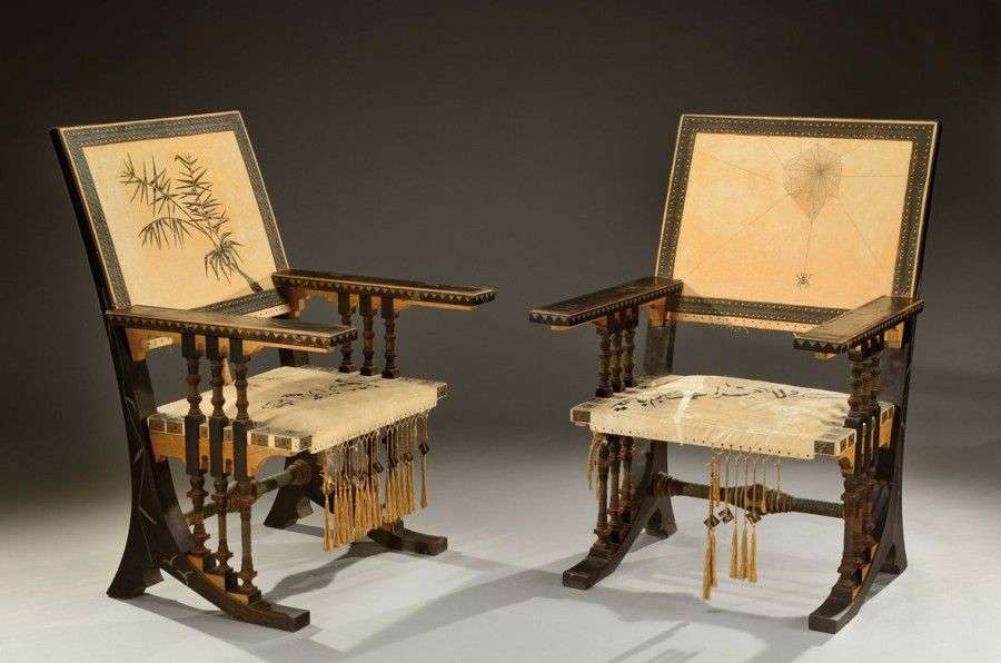 Importante paire de fauteuils architecturés en bois teinté noir à assise rectangulaire et dossier droit présentant des accotoirs détachés à manchettes plates reposant sur des petits montants balustres. Les montants arrière formant piétement en forme d'arc outrepassé sont reliés à des colonettes tournées. L'ensemble est agrémenté d'incrustations de laiton, de cuivre et de zinc et est souligné de pompons en façade. Le dossier et l'assise en peau de vélin tendue sont ornés d'un décor peint d'écritures Iznik, d'une toile d'arraignée, d'un cygne avec un roseau pour l'un et d'oiseaux, de feuilles de bambou et d'un héron pour l'autre. Vers 1900. H: 100 cm l: 66 cm P: 69 cm (manques, piqûres et accidents) Important pair of tinted wood and parchment armchairs decorated with brass, copper and zinc inlaid motifs. Circa 1900. H: 39 1/3 in l: 26 in P: 27 ¼ in Bibliographie: - Marie-Madeleine Massé, «Carlo Bugatti au musée d'Orsay, Catalogue sommaire illustré du fonds d'archives et des collections», Edition de la réunion des musée nationaux, Paris,2001, modèle similaire reproduit à la page 90,réferencé 8.4| 221 modèle similaire pour un canapé reproduit a la page 86 réferencé 7.41. Bernard Lamarche-Vadel Bernard Dufour Anna Lamparska-Rivet, «Bugatti les meubles Bugatti les sculptures, bugatti les autos», Editions de la Différence, Paris,1995, modèle similaire reproduit à la page 182.