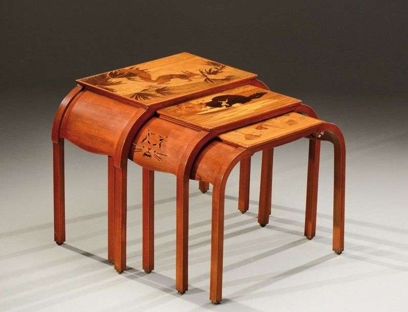 Suite de trois tables gigognes en hêtre teinté à plateaux rectangulaires présentant un décor marqueté en bois exotique à motifs d'oiseaux branchés, d'un écureuil et de chats. Elles reposent sur quatre pieds droits courbés de section carrée à décor ajouré sur les côtés. Signées «Gallé». Vers 1900. H: 47 cm L: 62 cm P: 29 cm (anciennes restaurations) A set of three tinted beech wood nests of tables with an exotic wood marquetry of birds, a squirrel and cats. Signed «Gallé». Circa 1900. H: 18 ½ in L: 24 ½ in D: 11 ½ in Bibliographie: Alastair Duncan et Georges de Bartha, «Gallé Furniture», Antique collectors club, 2012, modèle similaire reproduit à la page 205.