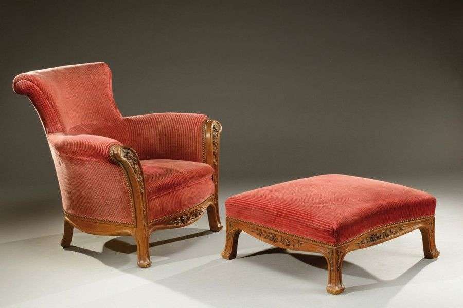 Important fauteuil et son pouf présentant un dossier courbé se prolongeant sur des accotoirs pleins et reposant sur quatre pieds galbés à décor sculpté de motifs floraux. Garniture des assises et du dossier recouvertes d'un velours rayé bordeaux. Vers 1900. H: 87,5 cm l: 80 cm P: 78 cm A large armchair and pouf carved with floral motifs and covered with Burgandy striped velvet. Circa 1900. H: 34 ½ in W: 31 ½ in D: 30 ¾ in
