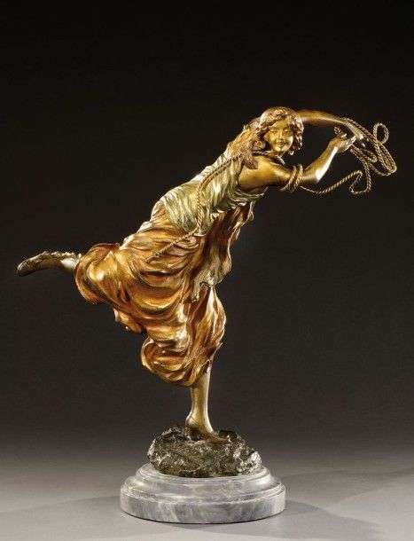 «La lanceuse de lasso» Sculpture en bronze dorée nuancé noire figurant une jeune femme avec un lasso. Elle repose sur une base circulaire moulurée en marbre gris veinée blanc. Signée sur la base| «C.J.R. Colinet». Fonte d'édition ancienne vers 1920. H: 43 cm L: 43 cm (manque une vis) A gilded bronze sculpture of a young woman with a lasso standing on a grey marble base. Signed on the base| «C.J.R. Colinet». Ancient cast, circa 1920. H: 17 in L: 17 in Bibliographie: Bryan Catley, «Art Deco and other Figures», Antique collectors'Club, UK, 2008, modèle similaire reproduit à la page 123.
