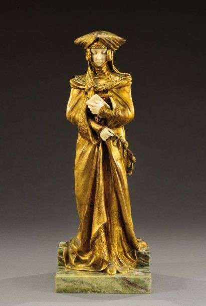 «Le secret» Sculpture chryséléphantine en bronze doré et ivoire terminée par une base à gradin en marbre vert veiné blanc. Signée «Grisard». Fonte d'édition ancienne, vers 1920-1930. H: 30 cm (éclat sur la base) A sculpture overlaid in gilded bronze and ivory with a stepped marble base. Signed «Grisard». Ancient cast, circa 1920-1930.. H: 11 ¾ in