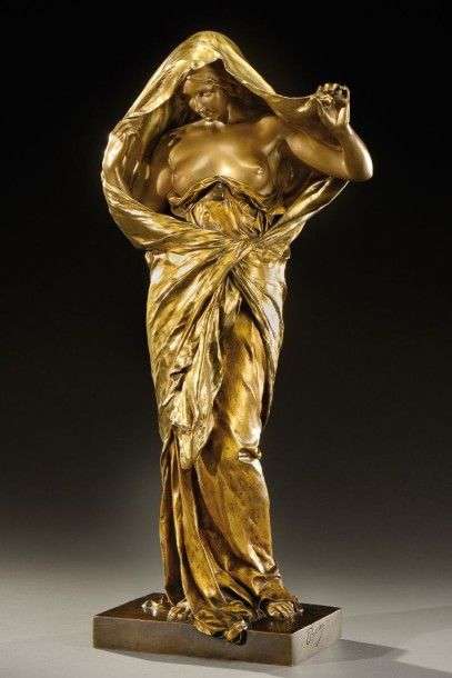 «La nature se dévoilant devant la science» Epreuve en bronze à patine dorée nuancée brune. Elle repose sur une terrasse rectangulaire. Signée «E.Barrias» et cachet du fondeur Susse Frères Editeurs Paris. Fonte d'édition ancienne, vers 1900. H: 59 cm. Sculpteur français du XIXe, il entre à l'Ecole des Beaux Arts à Paris en 1858 et obtient le 1er prix de Rome en 1865. Parmi ses nombreuses oeuvres sculptées, la plupart réalisées en marbre, «La Nature se dévoilant devant la Science» est la plus célèbre. Une première version en marbre et onyx (conservée au Musée d'Orsay) est commandée en 1889 pour orner la façade de la Faculté de Médecine de Bordeaux. Suivra une seconde version destinée à l'escalier d'honneur du Conservatoire des Arts et Métiers de Paris. Des sculptures en bronze seront réalisées par la suite. La jeune femme représentant l'allégorie de la Nature, soulève d'un geste lent les voiles l'enveloppant. L'artiste prouve par cette oeuvre son génie à exacerber les capacités des matériaux afin de donner un effet de richesse surprenant. A large gold and brown patina bronze proof. Signed «E.Barrias» and foundry stamp Susse Frères Editeurs Paris. Ancient cast, circa 1900. As a French sculptor of the 19th century, he entered the Ecole des Beaux Arts of Paris in 1858 and obtained the 1st prix de Rome in 1865. Amongst his many, mostly marble sculptures «La Nature se dévoilant devant la Science» is the most famous. A first version, in marble and onyx (conserved in the Musée d'Orsay) was ordered in 1889 to adorn the façade of the of the Faculté de Médecine de Bordeaux, followed by a second version for the ceremonial staircase of the Conservatoire des Arts and Métiers de Paris. The bronze sculptures were made afterwards. The young woman representing the allegory of Nature slowly lifts the veil that covers her. This sculpture proved the artist's genius to intensify the capacities of materials and to render them extremely rich. H: 23 1/4 in Bibliographie: - Pierre Cadet, «Sus