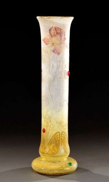 Exceptionnel vase à corps tubulaire évasé en partie haute sur talon plat renflé en verre doublé à décor dégagé à l'acide et émaillé de roses et de motifs géométriques polychromes rehaussés d'or et de cinq cabochons appliqués à chaud sur un fond marmoréen blanc et jaune. Signature à l'or «Daum Nancy». Vers 1900. H: 39 cm An exceptional lined glass vase acid-etched with roses, polychrome geometrical motifs heightened in gold and with heat applied cabochons on a marbled background. Signature in gold «Daum Nancy». Circa 1900. H: 15 ¼ in Bibliographie: - Clothilde Bacri, «Daum», Michel Aveline Editeur, 1992, modèle similaire reproduit à la page 54. - Galerie Katharina Büttiker, «Daum Nancy III», Zürich, modèle similaire reproduit à la page 65.