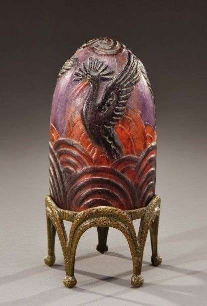 Rare lampe veilleuse «Huppes» à armature circulaire en bronze patiné composé de cinq pieds arqués terminés par des sphères enserrant une tulipe conique en pâte de verre mauve, orange et brune à décor en léger relief de coqs et d'enroulements. Signée «G.Argy Rousseau» et «France». Vers 1920. H: 20 cm «Huppes», a rare bronze night light with five arched legs ending I spheres holding pâte-de-verre tulip shades decorated with cocks and coils. Signed «G.Argy Rousseau» and «France». Circa 1920. H: 7 ¾ in Bibliographie: Janine Bloch-Dermant, «Les pâtes de verre, catalogue raisonné G. Argy-Rousseau», les Editions de l'amateur, Paris, 1990, modèle similaire reproduit aux pages 119 et 207. Modèle de base similaire reproduit aux pages 122 et 21