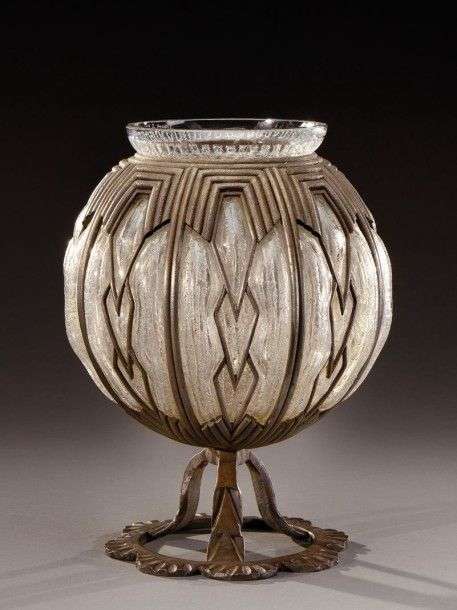 Rare vase à panse sphérique et col étranglé évasé en verre translucide, à surface dégagé à l'acide, soufflé dans une résille en fer forgé martelé formant piétement polylobé. Signé «L.Majorelle» et «Daum Nancy France». Vers 1920-1925. H: 35 cm A rare spherical translucent glass vase with an acid-etched surface and blown into a hammered wrought iron netting base. Signed «L.Majorelle» and «Daum Nancy France». Circa 1920-1925. H: 13 ¾ in
