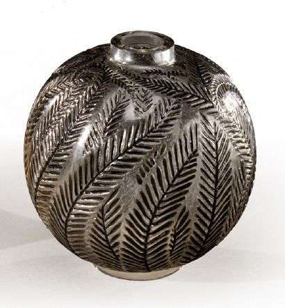 Vase «Meduse» de forme boule en verre moulé-pressé patiné noir. Signé «R.Lalique France» et numéroté. Modèle créé en 1923. H: 12 cm «Meduse», a ball shaped moulded-pressed, black patina glass vase. Signed «R.Lalique France» and numbered. Model created in 1923. H: 4 ¾ in Bibliographie: Félix Marcilhac, «Catalogue raisonné de l'oeuvre de verre de Lalique», éditions de l'Amateur, Paris, 2004, modèle similaire reproduit page 428, sous le numéro 952.