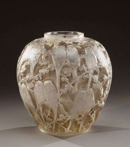 Vase «Perruches» de forme ovoïde en verre soufflé-moulé teinté gris. Signé «R.Lalique France» et numéroté. Modèle créé en 1919. H: 25 cm «Perruches» an ovoid shaped vase in grey tinted blown-moulded glass. Signed «R.Lalique France» and numbered. Model created in 1919. H: 10 in Bibliographie: Félix Marcilhac, «René Lalique 1860-1945», les Editions de l'Amateur, Paris, 2004, modèle identique reproduit à la page 410, numéro 876.