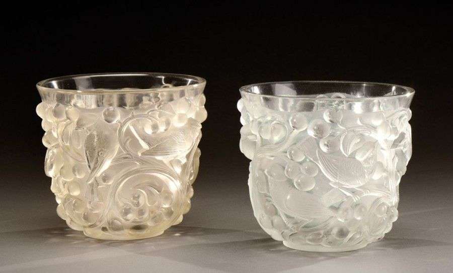 Suite de deux vases «Avallon» en verre moulé-pressé translucide et satiné. Signés «R.Lalique» et «R.Lalique France». Modèle créé en 1927. H: 14,5 cm et 15 cm «Avallon», a set of two moulded-pressed, translucent and satiny glass vases. Signed «R.Lalique» and «R.Lalique France». Model created in 1927. H: 5 ¾ and 6 in Bibliographie: Félix Marcilhac, «Catalogue raisonné de Lalique», Editions de l'Amateur, Paris, 2004, modèle similaire reproduit page 436, sous le numéro 986.