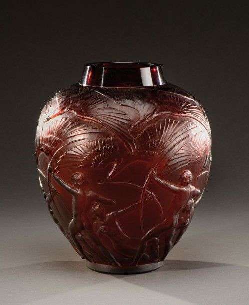Vase «Archers» en verre soufflé-moulé patiné ambre. Signé «R.Lalique». Modèle créé en 1921. H: 27 cm «Archers», a blown-moulded, amber patinated glass vase. Signed «R.Lalique». Model created in 1921. H: 10 3/4 in Bibliographie: Félix Marcilhac, «René Lalique, 1860-1945, maître verrier», les Editions de l'amateur, 2004, modèle similaire reproduit à la page 415, référence 893.