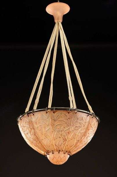 Rare lustre modèle «Feuilles de charme» à douze éléments en verre moulé-pressé assemblés sur une monture en métal nickelé et retenu par des anneaux. Cache-bélière en verre dépoli patiné. Signé «R Lalique». Modèle créé en 1921. H: 109 cm Diam: 49 cm «Feuilles de charme», a rare centre light with twelve moulded-pressed glass elements on a nickel-plated metal mounting. Signed «R Lalique». Model created 1921. H: 43 in Diam: 19 ¼ in Bibliographie: - Félix Marcilhac, «René Lalique 1860-1945», les Editions de l'Amateur, Paris, 2004, modèle identique reproduit à la page 642, numéro 2262. -Guillaume Janneau, «Le luminaire et les moyens d'éclairages nouveaux» Edition Charles Moreau, Paris, 1925 modèle similaire reproduit à la planche 48.