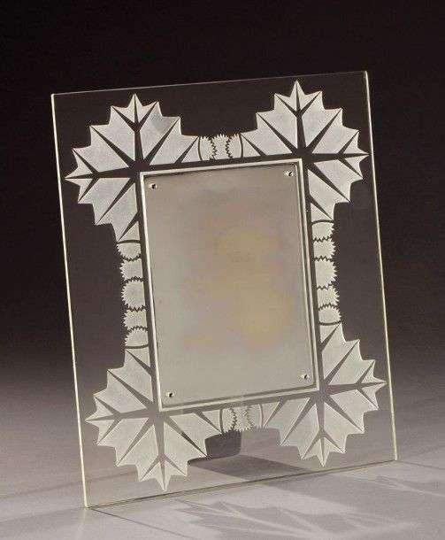 Miroir rectangulaire à encadrement en verre moulé-pressé à décor dégagé au sable de motifs floraux stylisés. Bien que ce miroir ne soit pas signé on retrouve dans celui-ci la même technique et le même montage utilisé par Lalique pour le modèle dit «Bluets» ou le «Muguet hirondelles» qui figurent au catalogue raisonné de l'artiste. Il est ainsi fort probable qu'il s'agisse d'un travail exécuté par un ouvrier de chez Lalique. H: 40 cm L: 34 cm A mirror framed in moulded-pressed glass with stylised floral motifs. Although this mirror has not been signed it uses the same technique and assembly as used by Lalique for the model know as «Bluets» or the «Muguet hirondelles» which figure in the artist's catalogue raisonné. It is therefore most probable that it was made by a Lalique workman. H: 15 ¾ in L: 13 ½ in