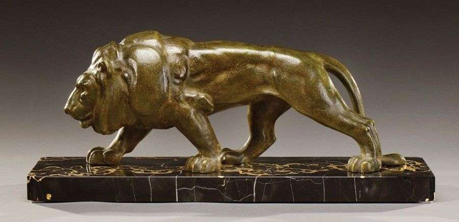 Epreuve en bronze à patine verte figurant un lion marchant. Il repose sur une base en marbre Portor. Signée «L.Gibert». Fonte d'édition ancienne, vers 1940. H: 49 cm L: 76 cm A green patina bronze proof of a walking lion on a Portor marble base. Signed «L.Gibert». Ancient cast, circa 1940. H: 19 ¼ in L: 30 in