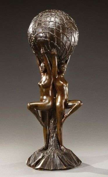 Epreuve en bronze à patine brune figurant trois femmes nues soutenant une sphère. Signée sur la base «A.Rousaud» et marquée «CFA.Paris». Vers 1930-1940. Praticien et disciple d'Auguste Rodin il a participé à de nombreuses oevres en bronze ou en marbre tels que les bustes de Victor Hugo (marbre éxécuté vers 1916-1917) ou de Mozart (marbre éxécuté en 1911), tous deux conservés par le musée Rodin. H: 72 cm Proof in brown patina bronze representing three nude women holding a sphere. Signed on the base «A.Rousaud» and marked «CFA.Paris». Being a practitioner for Auguste Rodin and his disciple he took part in much of the work in bronze or marble such as the busts of Victor Hugo (in marble, made around 1916-1917) or of Mozart (in marble, made in 1911), both pieces are kept in the Rodin Museum. Circa 1930-1940. H: 28 1/3 in.