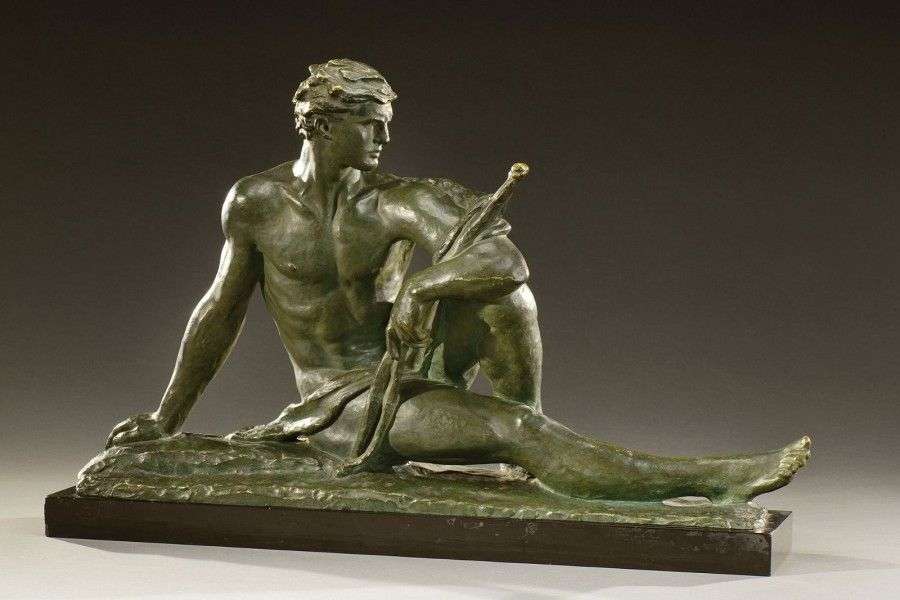 Importante épreuve en bronze à patine vert antique figurant un homme assis tenant un arc. Elle repose sur une base rectangulaire en marbre noir. Signée «Kelety», cachet du fondeur: «L.N Paris J.L Bronze» et numéroté. Fonte d'édition ancienne, vers 1930. H: 44 cm L: 71 cm A large bronze proof representing a man seated holding an bow, on a black marble base.Signed «Kelety», foundry stamp: «L.N Paris J.L Bronze» and numbered. Ancient cast, circa 1930. H: 17 ¼ in L:28 in
