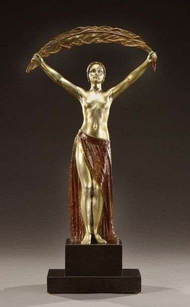 Important groupe en bronze à patine verte figurant une femme nue nourrissant un chevreau accompagné de sa mère. Elle repose sur une base à gradins en marbre noir veiné blanc agrémentée d'une branche d'olivier. Signée "Ary Bitter" et cachet du fondeur "LN Paris JL" sur la terrasse. Fonte d'édition ancienne, vers 1930. H: 39 cm L: 74 cm P : 26 cm (accidents au marbre) A green patina bronze group representing and nude woman feeding a lamb accompanied by its mother and standing on marble base adorned with an olive branch. Signed "Ary Bitter" and foundry stamp "LN Paris JL" on the base. Ancient cast, circa 1930. H: 15 ¼ in L: 29 ¼ in D : 10 ¼ in