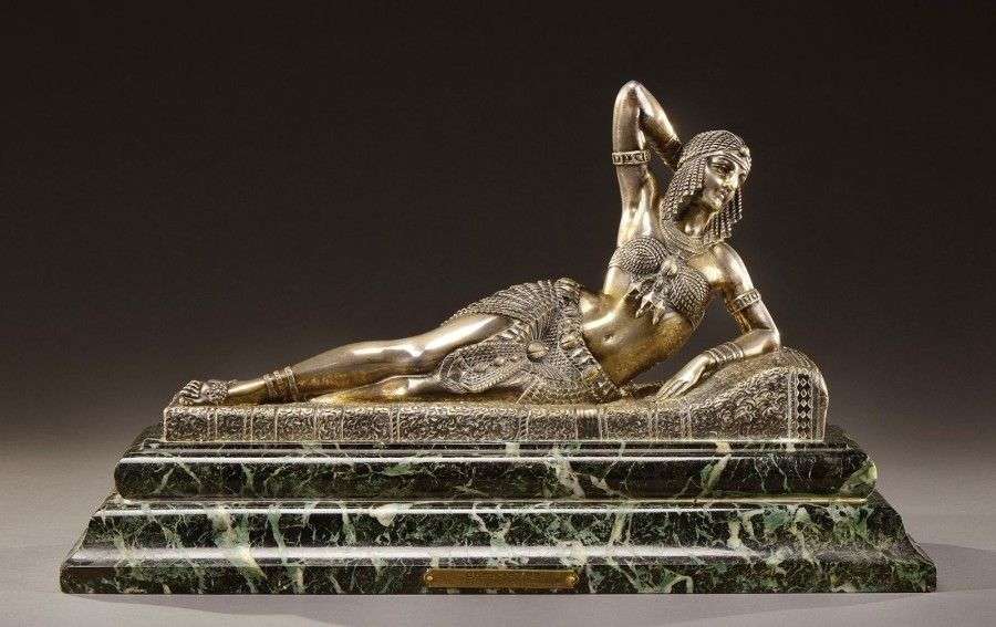 "Cléopâtre" Epreuve en bronze à patine argentée. Elle repose sur une base moulurée en marbre vert veiné. Signée "DH Chiparus" et plaquette en laiton titrée "Cléopâtre par D.H Chiparus Lauréat du Salon des Beaux-Arts". Fonte d'édition ancienne, vers 1925. H: 22 cm L: 37,5 cm P: 9,5 cm (sans socle) H: 31 cm L: 48,5 cm P: 17,5 cm (avec socle) A silver bronze proof on a green veined marble base. Signed "DH Chiparus" and small brass plate carrying the title "Cléopâtre par D.H Chiparus Lauréat du Salon des Beaux-Arts". Ancient cast, circa 1925. H: 8 ¾ in L: 14 ¾ in D: 3 ¾ in (without base) H: 12 ¼ in L: 19 in D: 7 in (with base) Bibliographie: Albert Shayo, «Chiparus, un sculpteur Art Déco», Editions Abbeville Press, Paris, 1993, modèle similaire reproduit à la page 108.
