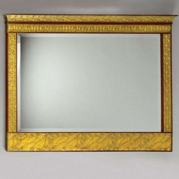 Miroir à encadrement en acajou et bois teinté or à décor sculpté en relief de frises d'oiseaux branchés et de motifs floraux et végétaux. Il enserre une glace rectangulaire biseautée. H: 93 cm L: 117 cm P: 5 cm (légères usures et manque) A mirror framed in mahogany and gold tinted wood carved with borders of birds and floral and plant motifs. H: 36 ½ in L: 46 in D: 2 in