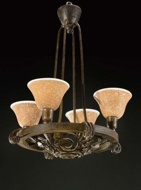 Lustre à armature circulaire en fer forgé à décor d'enroulements et de volutes présentant quatre bras de lumière terminés par des cache-ampoule coniques évasés en verre blanc opaque à décor dégagé à l'acide patiné. Signé "Daum Nancy France" et "E.Brandt". Vers 1930. H: 67 cm Diam: 32 cm A wrought iron centre light with four branches of lights ending in opaque plain glass shades with an acid-etched decoration. Signed "Daum Nancy France" and "E.Brandt". Circa 1930. H: 26 ½ in Diam: 12 ½ in