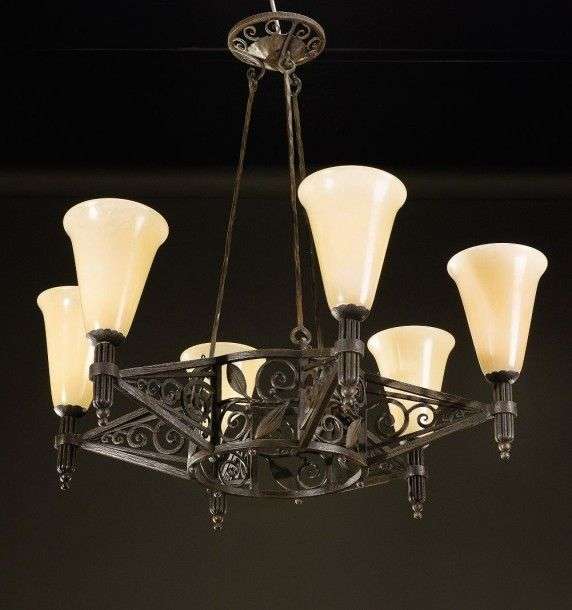 Lustre à armature circulaire en fer forgé martelé à décor ajouré de motifs floraux stylisés et d'enroulements présentant six bras de lumière surmontés de tulipes coniques en albâtre. Signé "L.Katona". Vers 1925. H: 67 cm Diam: 72 cm (albâtres modernes) A hammered wrought iron centre light with openwork floral motifs and six branches of lights surmounted by alabaster tulips. Signed "L.Katona". Circa 1925. H: 26 ½ in Diam: 28 ¼ in