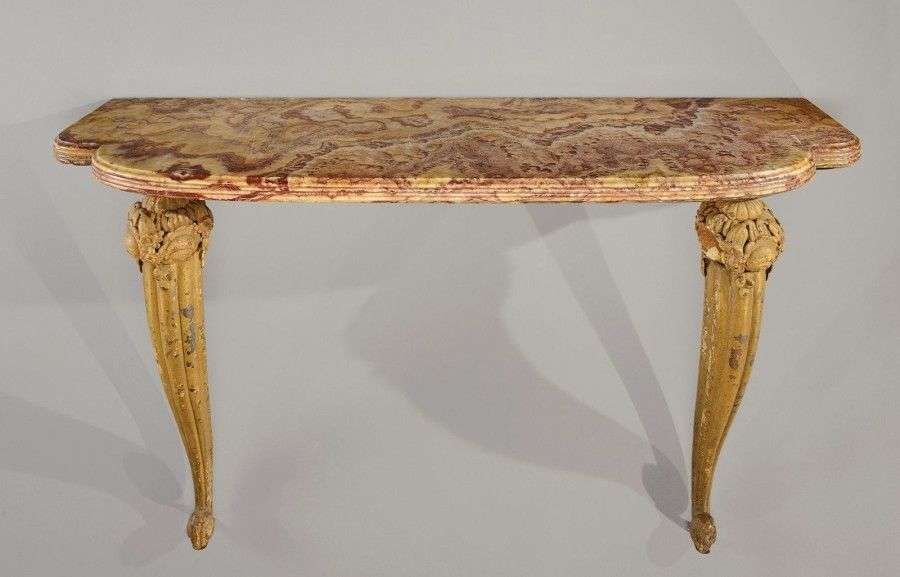 Rare console à plateau à découpe arrondie en onyx brun nuancé reposant sur deux larges montants galbés formant cornes d'abondances en tôle laquée crème à décor de motifs floraux en relief. Vers 1920-1925. Ce modèle de console existait avec une entretoise florale en relief et également en support de cheminée avec deux montants adossés. H: 90 cm L: 136 cm (usures, fixations non d'origine) A rare console with a brown onyx top standing on two lacquered cast iron uprights forming horns of plenty and decorated with floral motifs. Circa 1920-1925. This model of console existed with a floral crosspiece and also as a fireplace support. H: 35 ½ in L: 53 ½ in Bibliographie: Jean Badovici «Intérieurs de Sue et Mare», Edition Albert Morangé, modèl