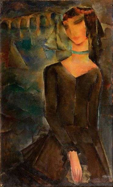 Huile sur toile figurant une femme devant une scène fluviale au pont. Signée en bas à droite et datée 1925. Dimensions: 82,5 x 50 cm (à vue) (petit manque en bas à gauche) An oil painting on canvas representing a woman in front of a river scene with a bridge. Signed on the lower right and dated 1925. Dimensions: 32 ½ x 19 ¾ in (visually)