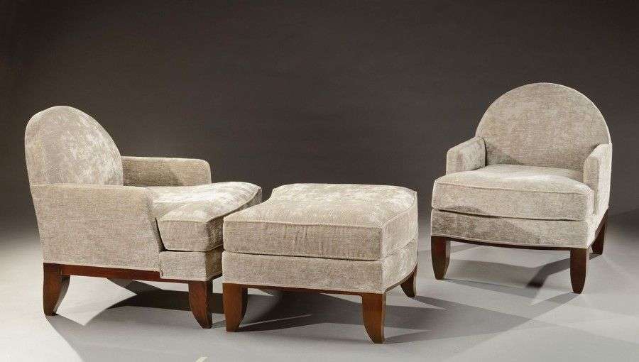 Paire de fauteuils bas et son repose-pieds en hêtre teinté présentant un dossier arrondi et des acotoirs pleins et reposant sur quatre pieds galbés. Vers 1935. H: 70 cm L: 59 cm P: 80 cm (légères usures) A pair of tinted beech wood low armchairs and footrests on curved legs. Circa 1935. H: 27 ½ in L: 23 ¼ in D: 31 ½ in