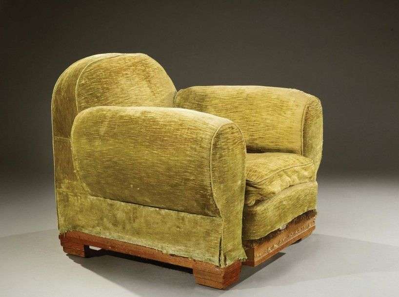 Important fauteuil «éléphant» en chêne à dossier droit cintré et larges accotoirs à oreilles arrondies reposant sur quatre pieds cubiques à gradins. Vers 1940. Ce modèle est à rapprocher du fauteuil «éléphant 276» créé en 1930 par Jacques-Emile Ruhlmann. H: 79 cm l: 100 cm P: 90 cm (usures et déchirures) An oak "éléphant" armchair with large armrests standing on four cubic, stepped legs. Circa 1940. This model is similar to that of the "éléphant 276" armchair created by Jacques-Emile Ruhlmann in 1930. H: 31 ½ in W: 39 1/3 in D: 34 2/3 in Bibliographie: Mobilier et décoration p. 12, 1948.