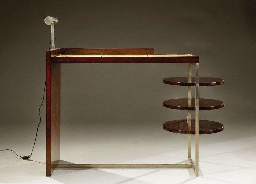 Bureau moderniste en placage de palissandre présentant un plateau rectangulaire gainé de parchemin agrémenté en partie haute d'un système d'éclairage. Il enserre sur un des côtés trois étagères circulaires superposées et repose sur un panneau droit et une structure quadrangulaire formant entretoise en métal nickelé. Vers 1930. H: 100cm L: 116 cm P: 40 cm (légères usures) A modernistic, rosewood veneer desk with a parchment covered top, a lighting system and three shelves on one side. Circa 1930. H: 39 ¼ in L: 45 ¾ in D: 15 ¾ in