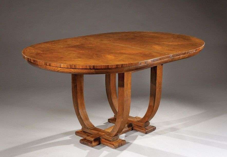 Table de salle à manger à plateau ovale en placage de palissandre de Rio reposant sur quatre montants pleins galbés reposant sur une base quadrangulaire à pans coupés. Etiquette d'origine au dos mentionnant le commanditaire le Docteur Decker. Vers 1929. Cette table a été commandée directement aux ateliers dePierre Chareau par le Docteur Decker à Paris. Pierre Chareau réalisa la décoration de celui-ci en 1929. H: 73 cm L: 154 cm P: 100,5 cm (rayures d'usage, allonges manquantes) A dining room table with a Rio rosewood veneer top. The original label on the back mentions the name of Docteur Decker who ordered the table. Circa 1929. This table was ordered directly from Pierre Chareau'sworkshop by Docteur Decker. His apartment was decorated by Pierre Chareau in 1929. H: 28 3/4 in L: 60 2/3 in D: 39 1/2 in Bibliographie:Marc Velley, Kenneth Frampton, «Pierre chareau», éditions du Regard, Paris, 1984, pages 84 et 85. - Bian Brace Taylor, «Pierre Chareau», edition Taschen, cologne, 1992, pages 94 et 95. - «L'Amour de l'art», août 1925, n°8 page 315 pour une variante du modèle. - «Art et Décoration», 1932, page 137.