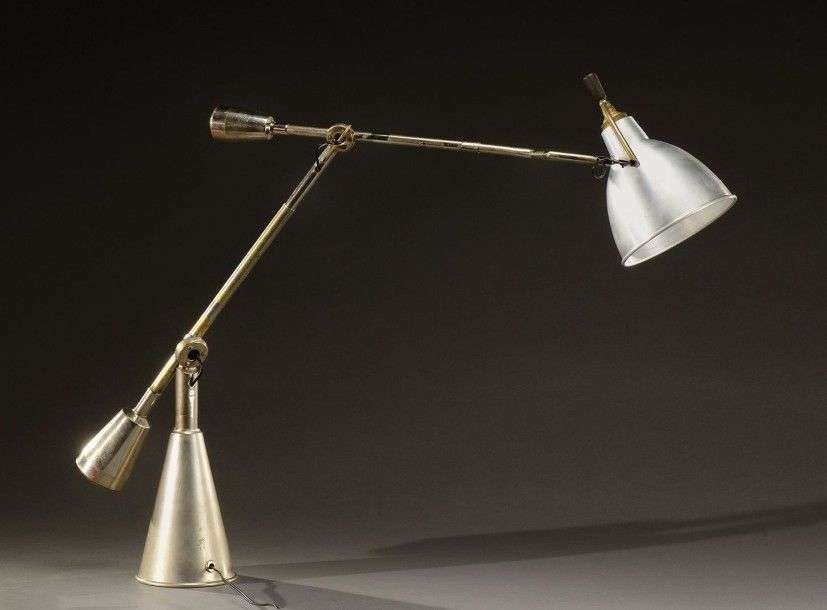 Lampe de bureau en métal nickelé composé de deux bras orientables à balancier montés sur des rotules et se terminant par un réflecteur conique. Elle repose sur une base circulaire conique. Vers 1930. H: 83 cm A nickel-plated desk lamp with two adjustable branches on a balancing wheel and ending with a conical reflector. Circa 1930. H: 32 ¾ in Bibliographie: "Nouveau intérieur français", Edition Charles Moreau, Paris, 1933, modèle similaire reproduit planche 7.