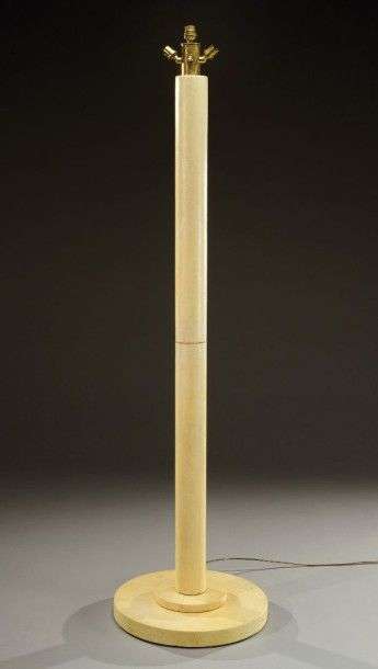 Lampadaire à fût tubulaire reposant sur une base circulaire à gradins entièrement recouvert de parchemin. Vers 1940. H: 151 cm A standard lamp with a tubular support on a stepped base covered with parchment. Circa 1940. H: 59 ½ in
