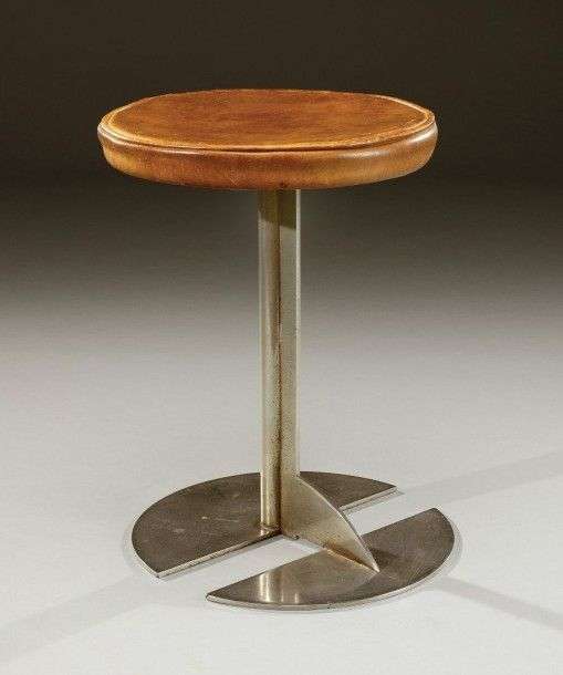 Rare tabouret moderniste en bronze argenté à fût tubulaire à ailette galbé se prolongeant sur une double base composée de deux demi-cercles. Il propose une assise circulaire entièrement recouverte d'un cuir fauve. Vers 1930. H: 46 cm Diam: 34,5 cm A rare, silver bronze modernistic stool with a tubular support standing on a two half circle base and with a seat covered in fawn coloured leather. Circa 1930. H: 18 in Diam: 13 ½ in