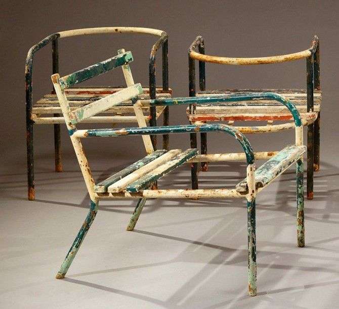 Rare fauteuil moderniste à armature formant piétement et accotoirs en métal tubulaire laqué vert et blanc, enserrant une assise et un dossier en lattes de bois. Vers 1930. H: 70 cm l: 53 cm P: 71 cm (usures, manques et accidents) A rare modernistic armchair with a tubular metal framework holding a seat and backrest in wooden slats. Circa 1930. H: 27 ½ in W: 20 ¾ in D: 28 in Bibliographie: Guillemette Delaporte "René herbst pionnier du mouvement moderne" Edition flammarion, Paris, 2004. Modèle reproduit à la page 126 au numéro 12.