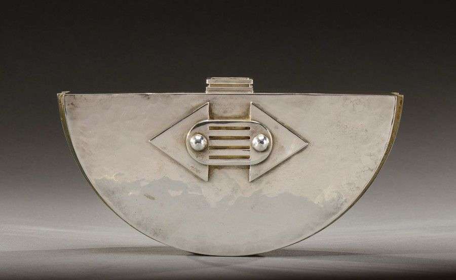 Rare vase moderniste à corps demi-hémisphérique en métal argenté à surface martelée et unie, souligné au centre par des motifs géométriques superposés et par deux filets débordants sur les côtés. Signé «J.Després» et poinçon de l'orfèvre. Vers 1930. H: 11,5 cm L: 22 cm P: 6,5 cm A rare modernistic vase in hammered and plain silver-plated metal with superimposed geometric motifs and fine jutting lines on the sides. Signed «J.Després» and silversmith's hallmark. Circa 1930. H: 4 ½ in L: 8 ¾ in D: 2 ½ in