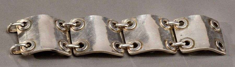 Bracelet en argent martelé composé de quatre mailles quadrangulaires percées aux angles. Signé "J.Després" et poinçon de l'artiste. Vers 1950. L: 17,5 cm Poids brut: 90 g A hammered silver bracelet composed of four quadrangular links pieced in the corners. Signed "J.Després" artist's hallmark. Circa 1950. L: 7 in Weight: 0,20 Ibs Bibliographie: Melissa Gabardi, "Jean Després maestro orafo tra art déco e avanguarde", Idea books, Milan, 1999, modèle similaire pour un collier reproduit page 126.